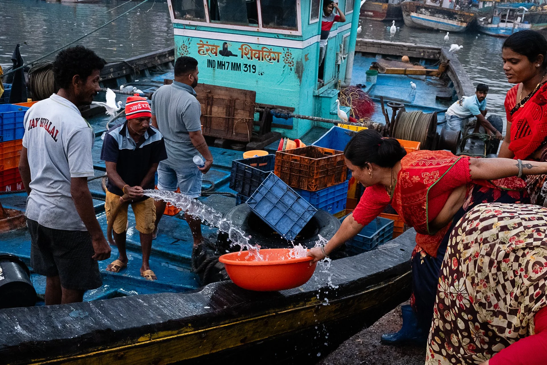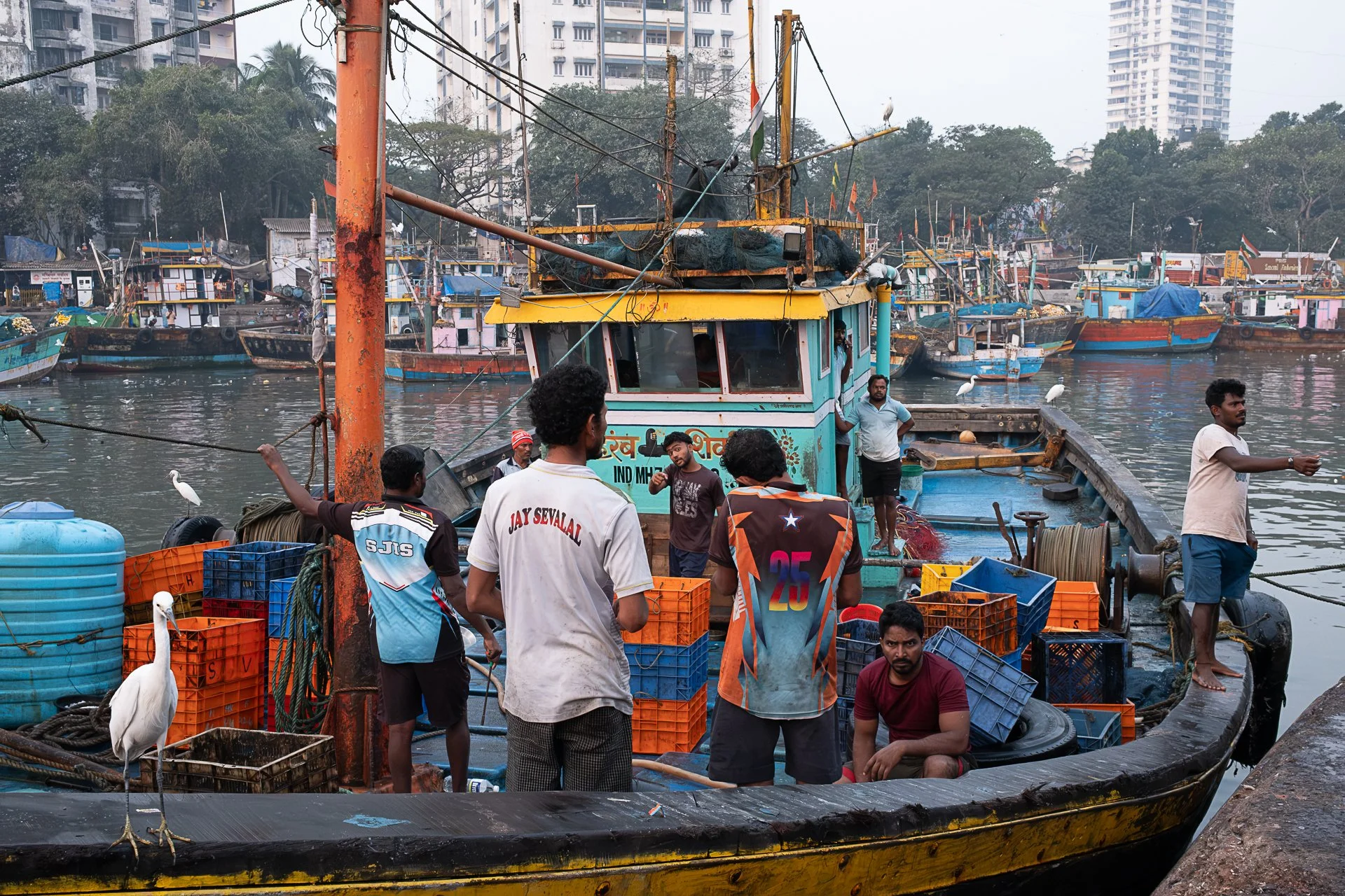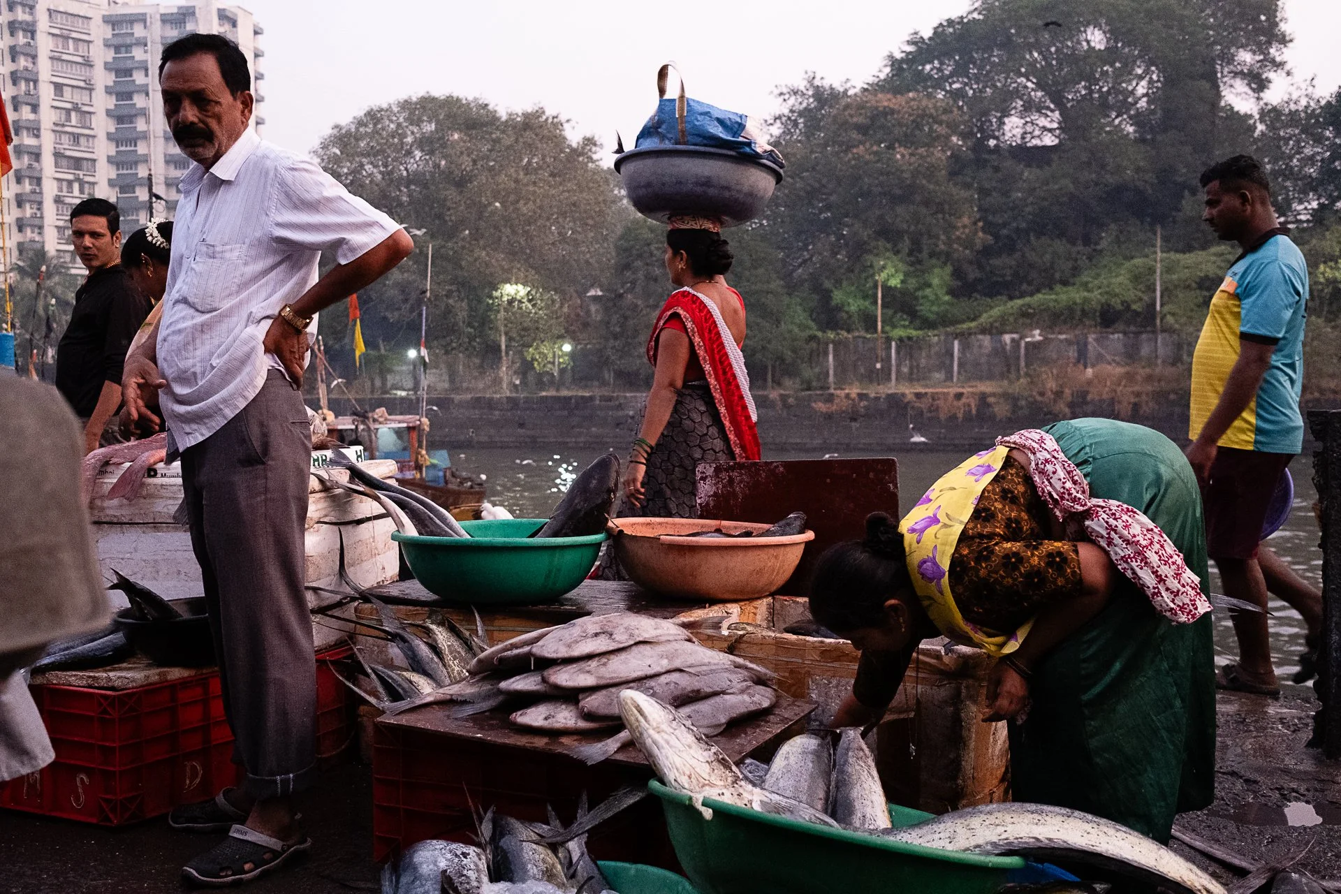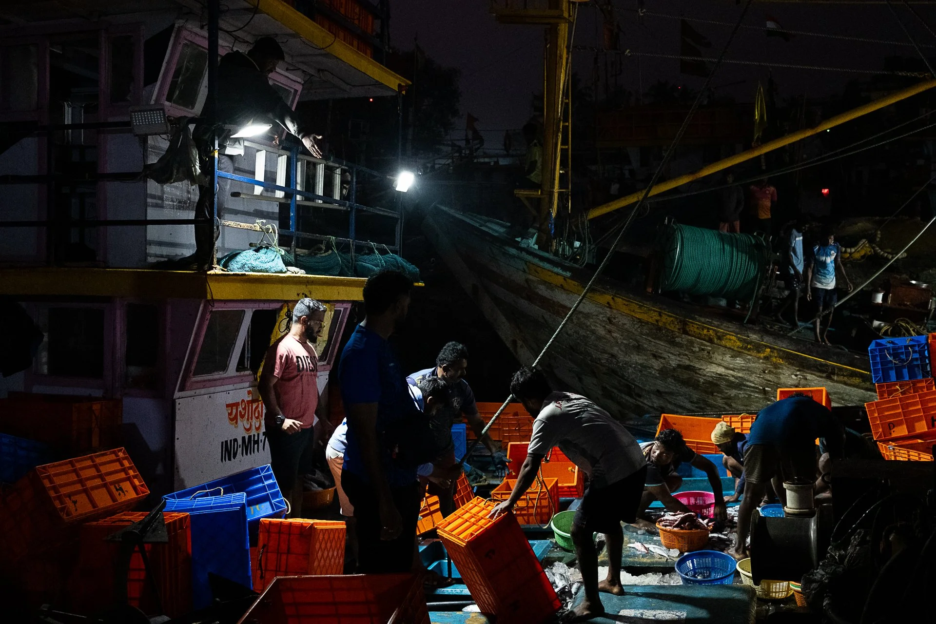 Antes del amanecer ya hay una multitud esperando a los pescadores en la lonja de pescado de Mumbai. Sassoon Dock se vislumbra únicamente por los halógenos distribuidos por los puestos donde se aguarda con ansia la mercancía.